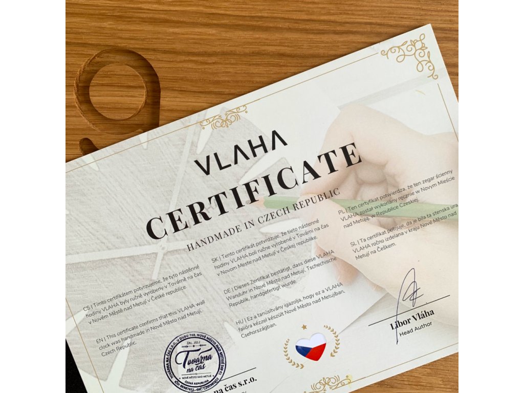 Povrch dřeva je napuštěn přírodním lněným olejem, který vykreslí originální strukturu dřeva a dodá jí typický dubový tón. Do povrchu jsou zafrézované elegantní číslice. Hodiny pohání kvalitní německý strojek UTS, jehož tikání není slyšet. Ke každému vyrobenému kusu získáte certifikát dokládající výrobu v České Republice.